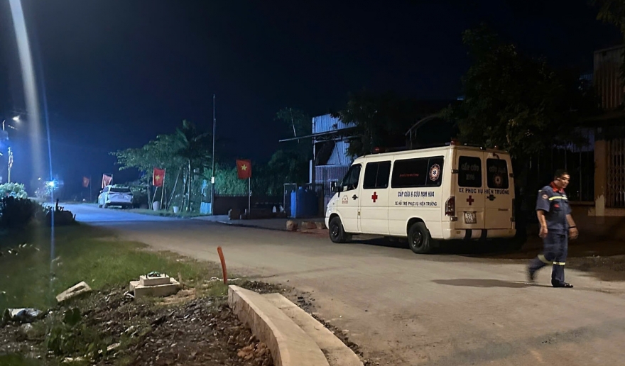 Theo người nhà, bà Q. tử vong trong tư thế nằm ngửa, vùng gáy bị đa chấn thương lõm sâu, máu bắn lên tường; khuôn mặt bị che bằng tấm bạt màu xanh.