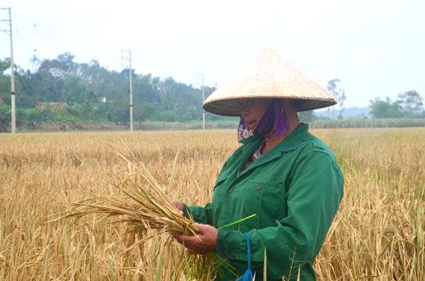Nước sông Con hiện đã xuống thấp, để lại cảnh những cánh đồng lúa ven sông Con ngả một màu vàng sẫm của bùn đất, đổ ngã nhiều khiến người không mặn mà lắm với việc thu hoạch mang về.