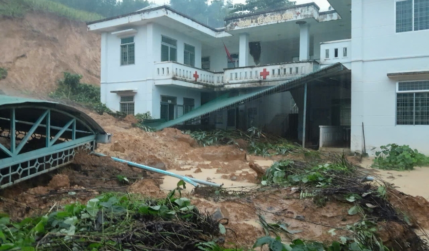 Một vụ sạt lở nghiêm trọng lúc sáng sáng tại Trạm Y tế xã Tây Trà (tỉnh Quảng Ngãi) khiến toàn bộ nhà giữ xe và mái che bị cuốn sập