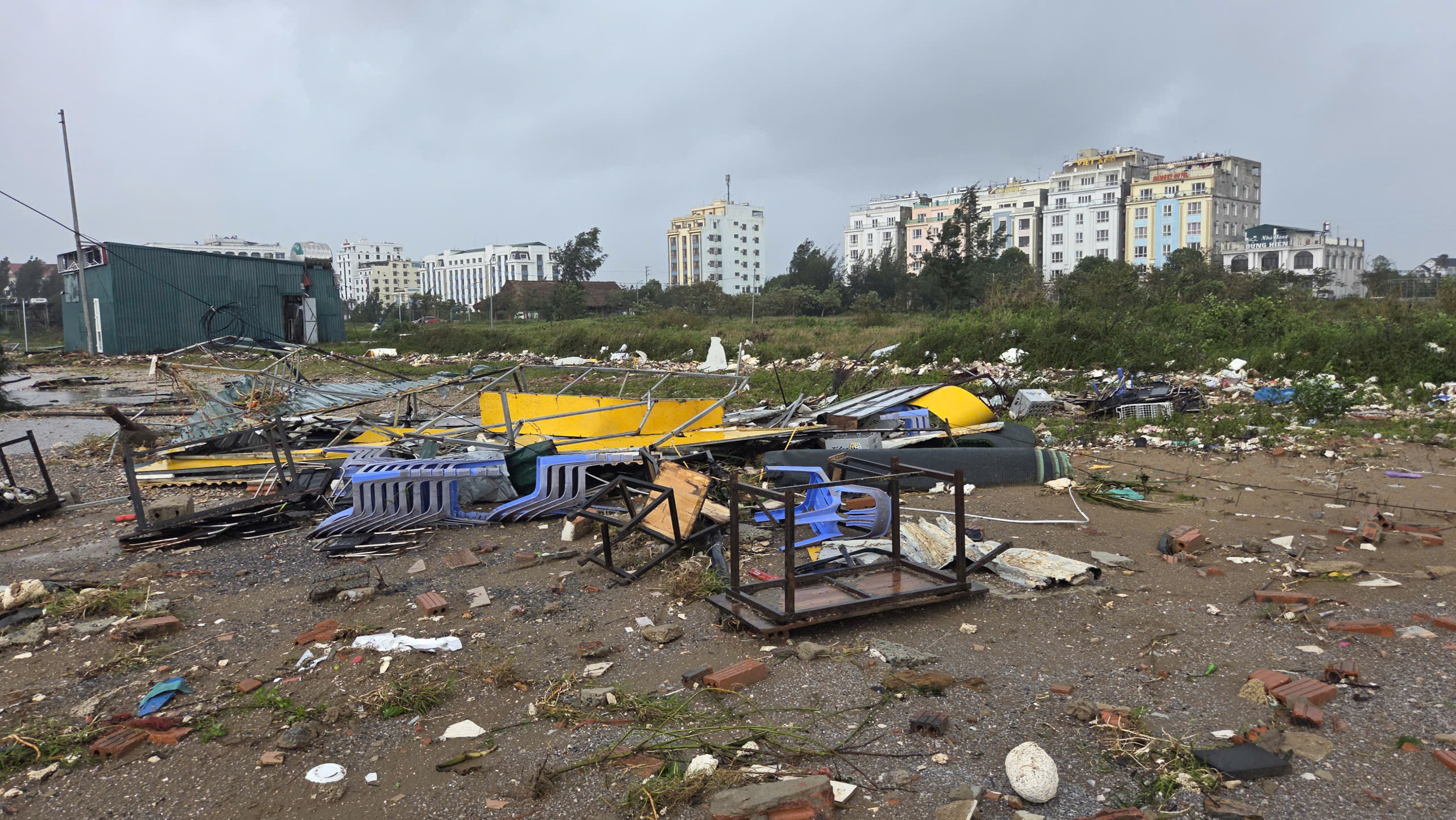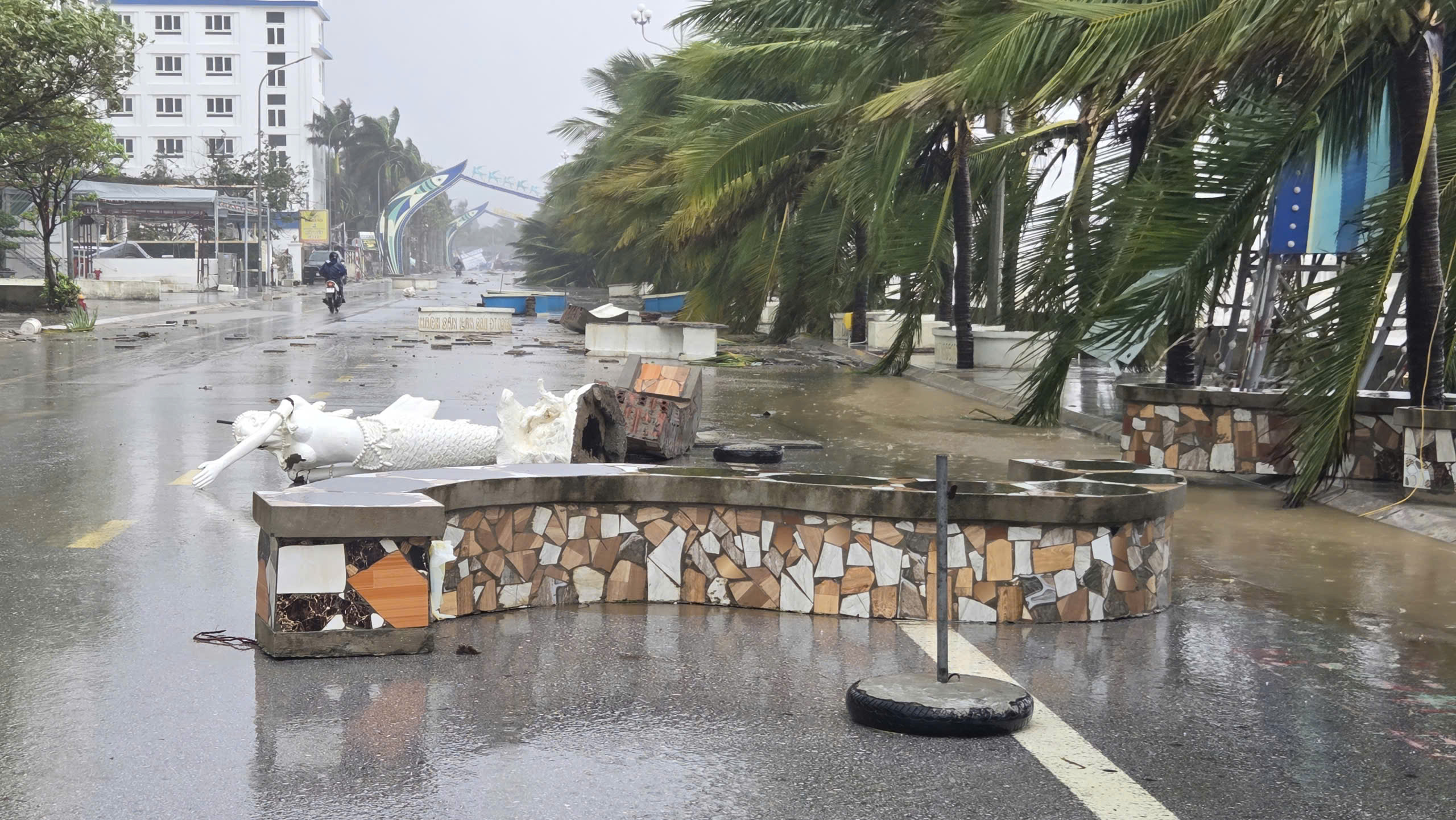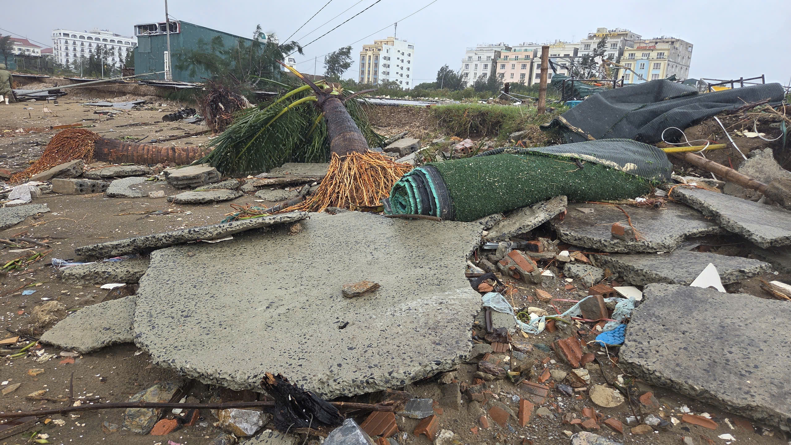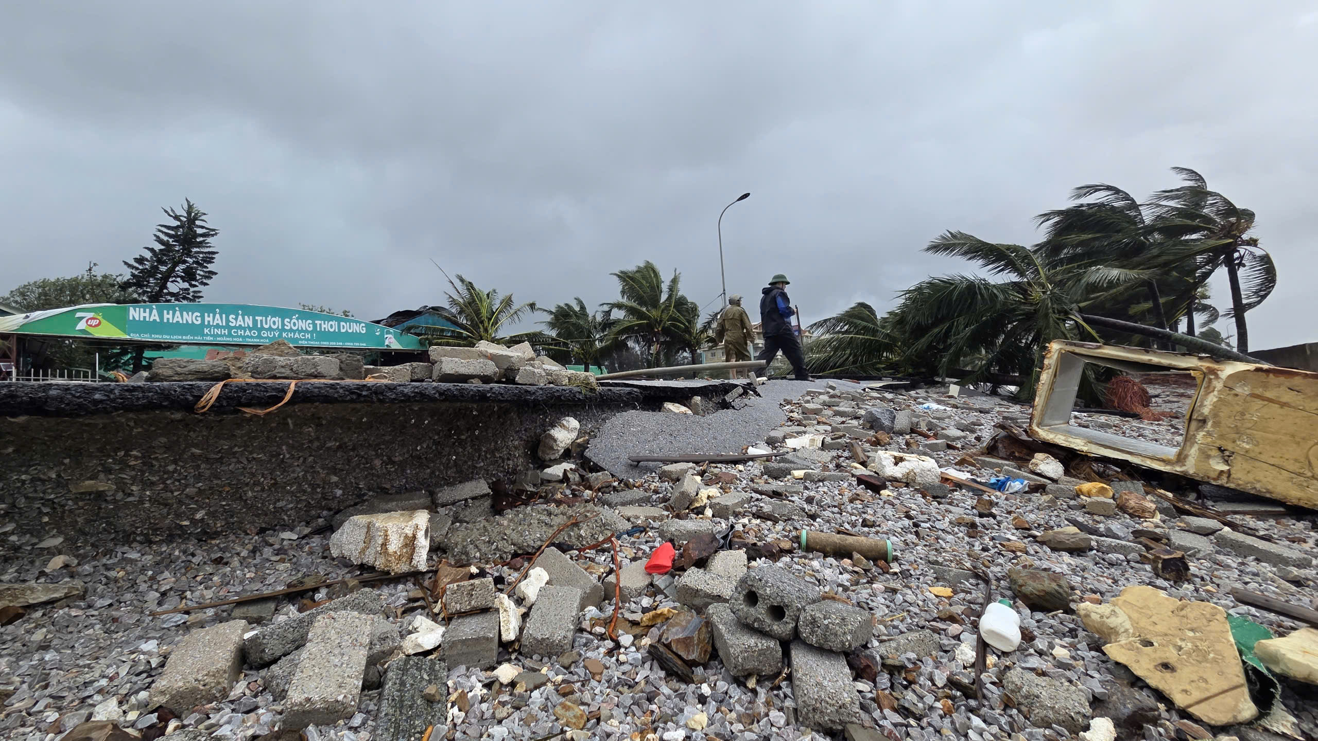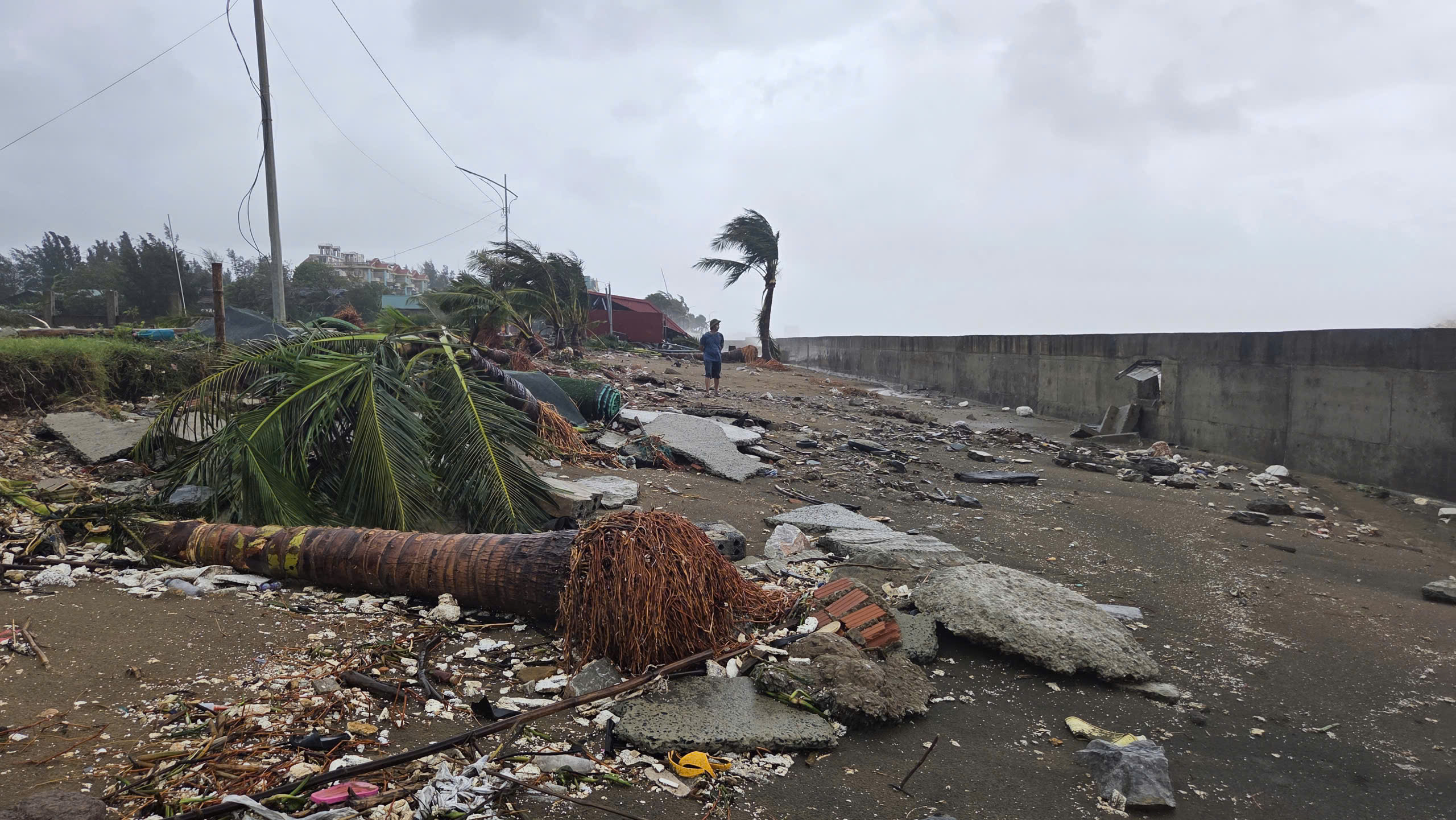 Trên các tuyến đường dẫn ra biển, nhiều công trình trang trí, biểu tượng bị gió đánh gãy đổ, nước mưa ngập lênh láng, rác thải và gạch đá chất thành từng đống. Một số đoạn điện lưới bị ảnh hưởng do cột, dây cáp rơi xuống đường, tiềm ẩn nguy hiểm.