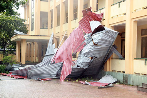 Mái tôn phòng học Trường THCS Lê Thị Bạch Cát bị cơn bão đánh bay xuống sân trường