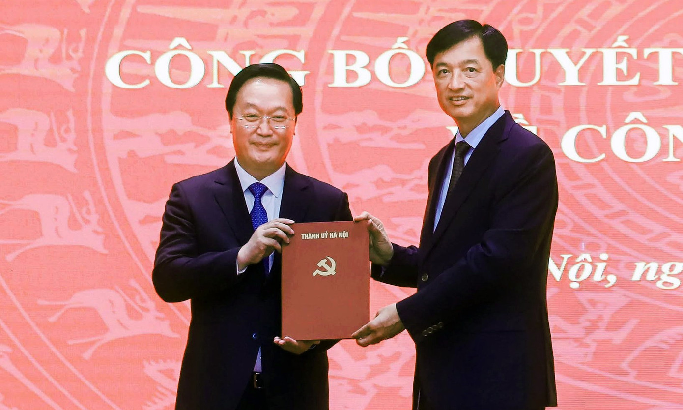 Bí thư Thành ủy Hà Nội Nguyễn Duy Ngọc trao quyết định của Bộ Chính trị điều động, chỉ định ông Nguyễn Đức Trung tham gia Ban Chấp hành, Ban Thường vụ, giữ chức Phó Bí thư Thành ủy Hà Nội khoá XVIII.