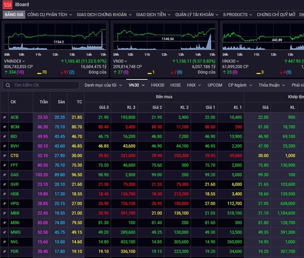 Chốt phiên giao dịch ngày 13/7, VN-Index tăng 11,22 điểm lên 1.165,42 điểm, khối lượng giao dịch đạt hơn 806,7 triệu đơn vị, tương ứng hơn 16.684,4 tỷ đồng.