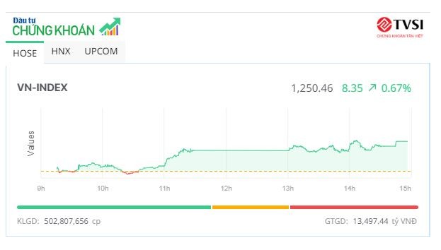 Mặc dù chưa đủ sức để bốc đầu tăng tốc bởi dòng tiền tham gia khá yếu, nhưng sắc xanh đã lan rộng bảng điện tử, với điểm sáng từ cổ phiếu FPT, đã giúp VN-Index thử thách thành công mốc 1.250 điểm.