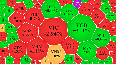 Áp lực bán gia tăng khiến thị trường chìm trong sắc đỏ, các chỉ số lần lượt lùi về vùng giá thấp ngày. Trong khi đó, nhóm cổ phiếu chứng khoán vẫn đi ngược xu hướng thành công khi đồng loạt đều giao dịch khởi sắc. -