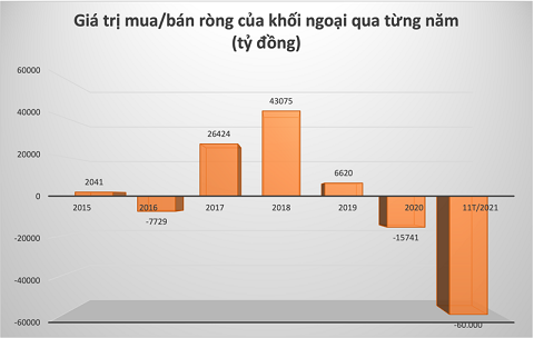 Ròng rã suốt từ đầu năm 2021 đến nay, khối ngoại đã bán “không tiếc tay” trên sàn chứng khoán Việt Nam với giá trị lên đến gần 60.000 tỷ đồng...