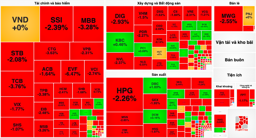 Tâm lý chốt lời mạnh, áp lực bán lan rộng khiến VN-Index giảm 21,11 điểm. Chỉ còn 2 nhóm thoát khỏi sự điều chỉnh là phương tiện truyền thông, du lịch và giải trí.