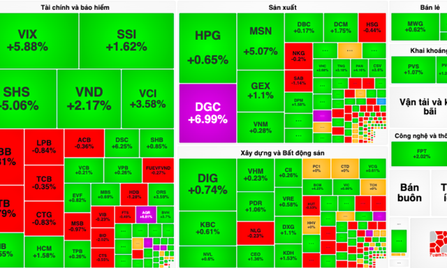 Hai cổ phiếu ngành bất động sản là DIG và KBC hút mạnh dòng tiền với thanh khoản đột biến lên trên nghìn tỷ đồng. KBC tăng kịch biên độ và là một trong các yếu tố đóng góp tích cực vào đà tăng chỉ số chung. -