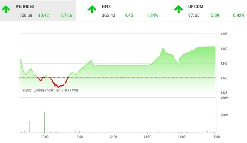 Tiếp nối đà tăng phiên sáng, bước sang phiên chiều thị trường chứng khoán chỉ có một nhịp giảm nhẹ trước khi tăng tiếp và đóng cửa ở mức giá cao nhất trong ngày, VN-Index đứng ở ngưỡng 1.350,68 điểm. Điều này cũng có nghĩa thị trường lấy lại toàn bộ số điểm đã mất đi trong phiên ngày hôm qua khi nhiều nhà đầu tư bán ra do tác động tâm lý từ vụ Evergrande có nguy cơ phá sản tại Trung Quốc.