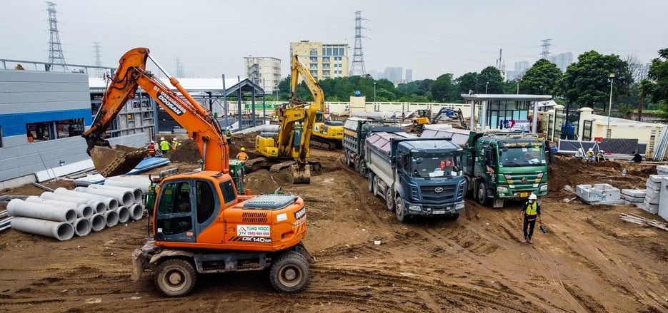 Hơn 500 công nhân cùng hàng chục máy móc thay nhau làm việc 24/24h trên công trường bệnh viện dã chiến hồi sức tích cực Covid-19 tại quận Hoàng Mai, Hà Nội.