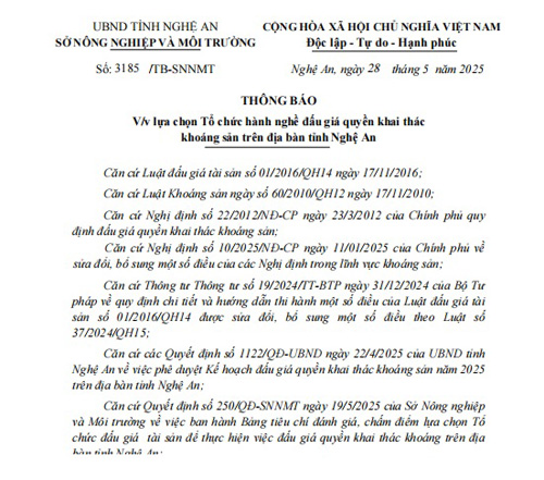 Thông tin từ Sở Nông nghiệp và Môi trường tỉnh Nghệ An cho biết, đơn vị vừa có thông báo lựa chọn tổ chức hành nghề đấu giá quyền khai thác khoáng sản năm 2025 trên địa bàn tỉnh.