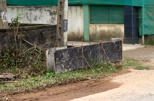 Đoạn đường khá hẹp, máy móc đang thi công hai bên đường, biển cảnh báo đặt ngoài lề đường, sắt thép đan cống thoát nước chĩa lên mà không có dây cảnh báo