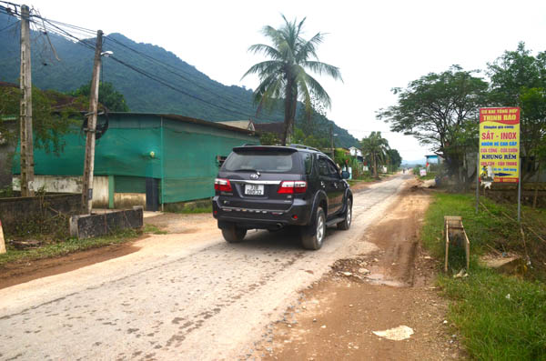 Qua quan sát, tuyến đường khá hẹp, máy móc, công nhân đang thi công đổ nhựa, hai bên lề được đổ đất, biển báo công trường để ra ngoài lề đường, sắt thép đan bên miệng cống thoát nước chĩa lên như chông mà không chăng dây cảnh báo.