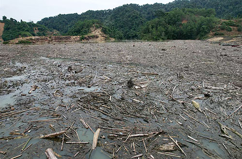 Rác trên hồ thủy điện Hủa Na được gió đẩy về bủa vây đập phụ của hồ.