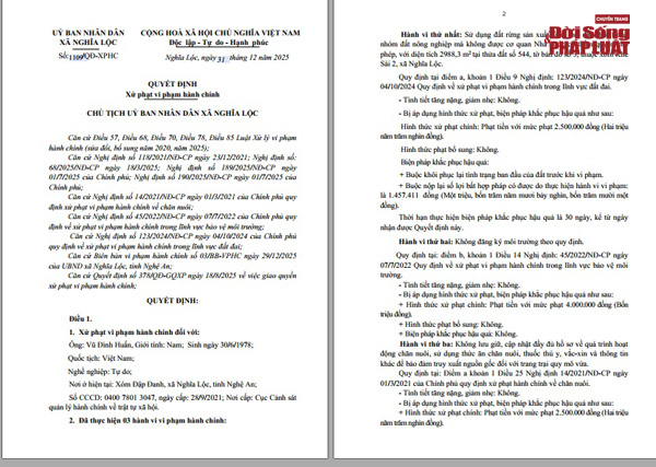 Thông tin từ chính quyền xã Nghĩa Lộc (Nghệ An) cho biết trang trại lợn của ông Vũ Đình Huấn nằm ở đầu nguồn suối Khe Đền, thuộc xóm Khe Sài 2 bị xử phạt thêm 3 hành vi vi phạm hành chính. Trước đó, trang trại này đã từng bị phạt hơn 61 triệu đồng với hành vi xả thải gây ô nhiễm môi trường.