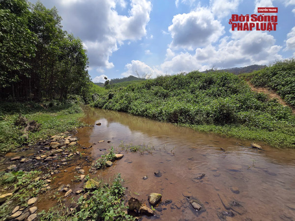 Ngày 17/3, PV ghi nhận nước suối Khe Đền đã trong trở lại, bờ hố chứa nước thải trang trại nằm sát dòng suối, cỏ dại mọc um tùm, lòng hố không có bạt lót, nước thải trong hố đen ngòm, bèo phủ kín mặt hố nước thải, một số chuồng trại đã được tháo dỡ.