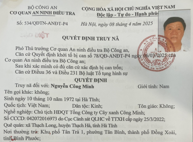 Cơ quan An ninh điều tra Bộ Công an ra lệnh truy nã đặc biệt đối với Nguyễn Công Minh; sinh ngày 10/10/1972 tại Hà Tĩnh; nghề nghiệp: Chủ tịch Hội đồng quản trị Tổng Công ty Cây xanh Công Minh.