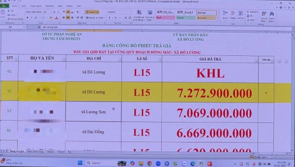 Lô đất “ngôi sao” L15 (205,7 m²), từ mức khởi điểm 4,28 tỷ đồng, đã được một nhà đầu tư có địa chỉ tại xã Đô Lương, tỉnh Nghệ An chốt ở mức giá 7,227 tỷ đồng (tăng 69,86%). Một lô khác là N13 (240,6 m²) cũng đạt mức 7,014 tỷ đồng từ giá khởi điểm 4,59 tỷ đồng (tăng 52,8%).