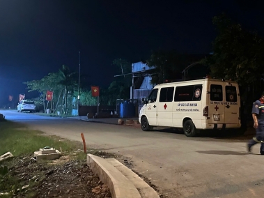 Theo người nhà, bà Q. tử vong trong tư thế nằm ngửa, vùng gáy bị đa chấn thương lõm sâu, máu bắn lên tường; khuôn mặt bị che bằng tấm bạt màu xanh.