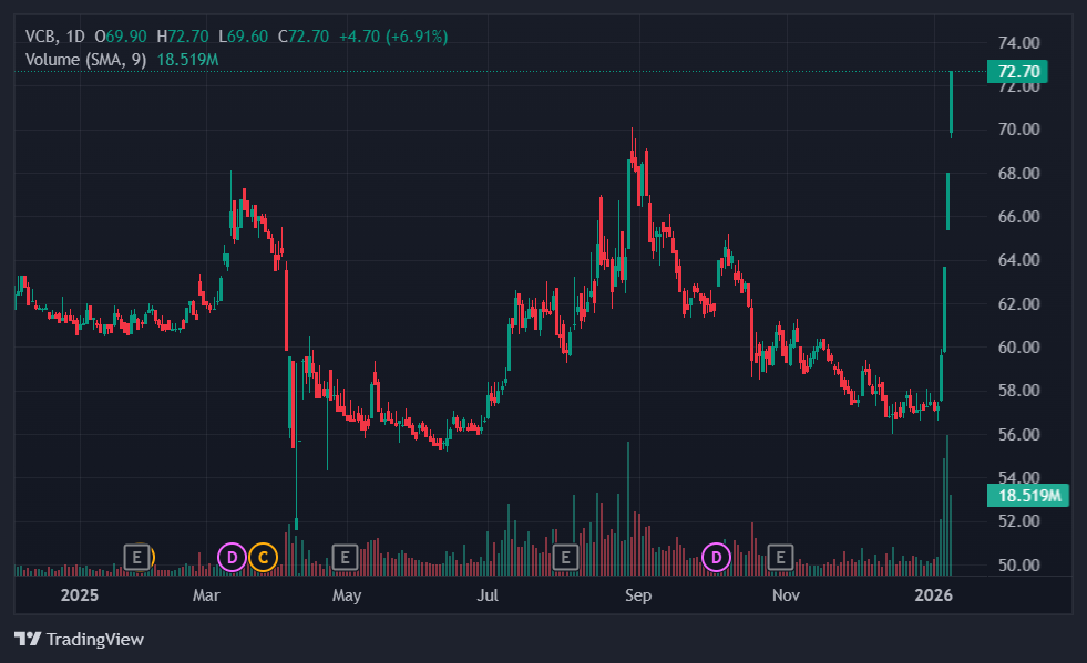 Với VCB của Vietcombank, cổ phiếu này tiếp tục tăng kịch biên độ lên mốc 72.700 đồng/cổ phiếu, qua đó chính thức phá đỉnh giá cũ thiết lập cách đây 4 tháng. Dù mới bước vào năm mới 2026, VCB đã đạt hiệu suất sinh lời lên tới 26%.