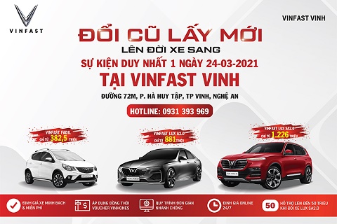 Chương trình “Đổi cũ lấy mới” tại TP Vinh Thời gian: 24/3/2021 (Một ngày Duy Nhất) Địa điểm: Đại lý VinFast – Chevrolet Vinh, Đường 72m, phường Hà Huy Tập, TP. Vinh. Hotline liên hệ : 0931 393 969 |