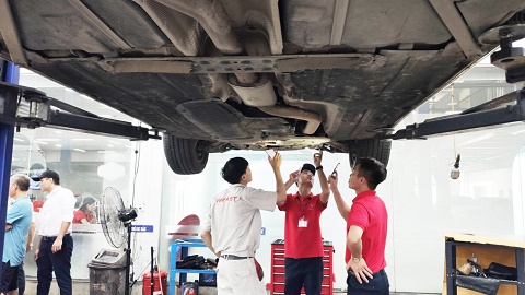 Các kỹ thuật viên đang kiểm tra và thẩm định xe cũ