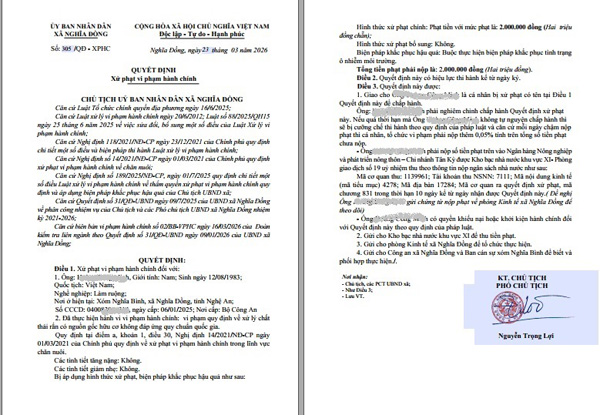 Hai hộ dân là ông Hoàng Công Đ. và ông Hoàng Công M. đều ở xóm Nghĩa Bình, xã Nghĩa Đồng (Nghệ An) bị xử phạt về hành vi vi phạm quy định về xử lý chất thải rắn có nguồn gốc hữu cơ không đáp ứng quy chuẩn Quốc gia. Mỗi hộ dân bị phạt 2.000.000 đồng (Hai triệu đồng), buộc khắc phục tình trạng ô nhiễm môi trường.