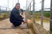 Sau cơn bão số 10, cầu treo Tân Thanh Hồng bắc qua sông Con nối hai xã Tân An và xã Nghĩa Hành, tỉnh Nghệ An bị lệch hơn 20cm khiến cho người dân bất an, lo lắng mỗi khi di chuyển qua đây. -