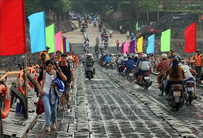 Sau khi lắp đặt xong, từ 6h ngày 30/9, người, xe thô sơ, xe mô tô, xe gắn máy, xe ô tô con và xe bán tải lưu được đi qua cầu phao Phong Châu (Phú Thọ).