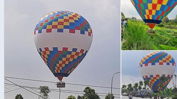 Chiếc khinh khí cầu chở theo 9 người bất ngờ đáp xuống khu vực đồng ruộng, gần đường quốc lộ khiến nhiều người hiếu kỳ.