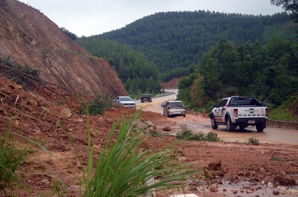 Do ảnh hưởng bão số 5 gây mưa kéo dài nhiều ngày, Quốc lộ 7C đoạn qua xã Bạch Ngọc, tỉnh Nghệ An sạt lở nghiêm trọng gây nguy hiểm, mất an toàn giao thông cho người và phương tiện qua lại.
