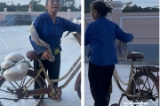 Dù nhà cũng bị ảnh hưởng do lũ lụt, cụ bà Trần Thị Quế (72 tuổi, xã Nghĩa Hành, Nghệ An) vẫn tự mình đạp xe, mang 20kg gạo đến trụ sở công an xã nhờ chuyển tới những người đang chịu thiệt hại nặng nề do lũ lụt.