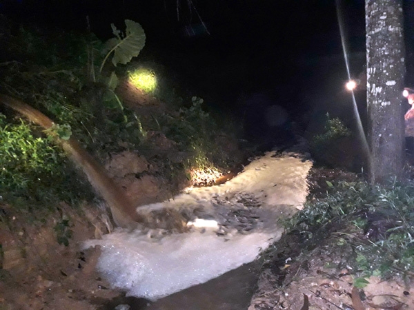 Trong đêm tối, ngửi thấy mùi hôi thối từ suối Khe Đền, hàng chục người dân xóm Khe Sài 2, xã Nghĩa Lộc, tỉnh Nghệ An đã dầm mưa, đội đèn đi ngược suối lên đầu nguồn và phát hiện trang trại lợn đang xả thải.