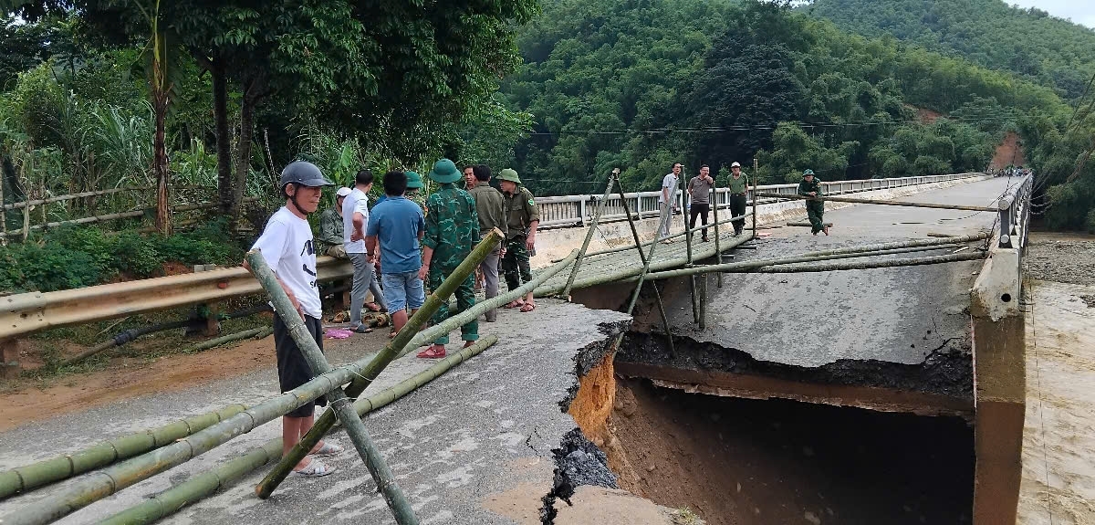 Mưa lũ do bão số 10 gây hư hỏng cầu Sơn Thủy trên Quốc lộ 16, chia cắt giao thông nhiều ngày, chính quyền và lực lượng chức năng đã dựng cầu tạm giúp người dân đi lại an toàn.