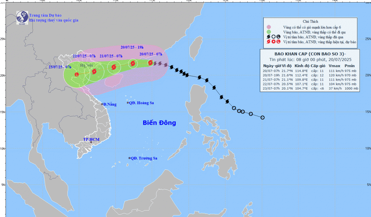 Bão số 3 đang mạnh cấp 11, giật cấp 14, di chuyển nhanh theo hướng Tây Tây Bắc hướng vào khu vực Vịnh Bắc Bộ.
