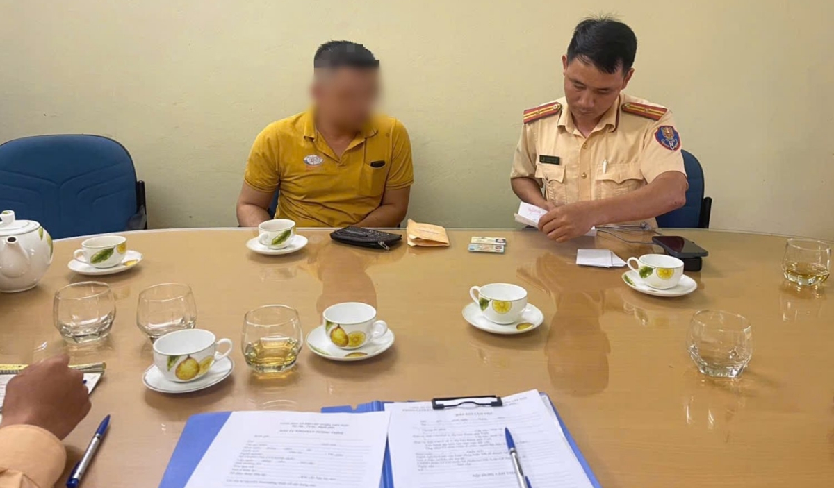 Tổ CSGT địa bàn TP Vinh (Phòng CSGT Công an tỉnh Nghệ An) lập biên bản xử phạt hành chính tài xế xe buýt đẩy cửa đập vào cặp vợ chồng đang chở con nhỏ trên đường. -