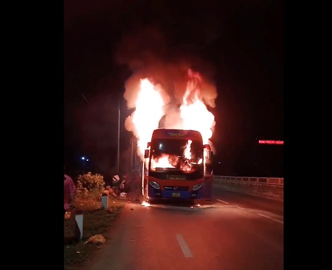 Chiếc xe khách đang đi trên quốc lộ 1 qua địa phận Khánh Hòa thì bốc cháy trước kính lái nên tài xế cho xe tấp vào lề, 34 hành khách và nhân viên bỏ chạy thoát nạn.